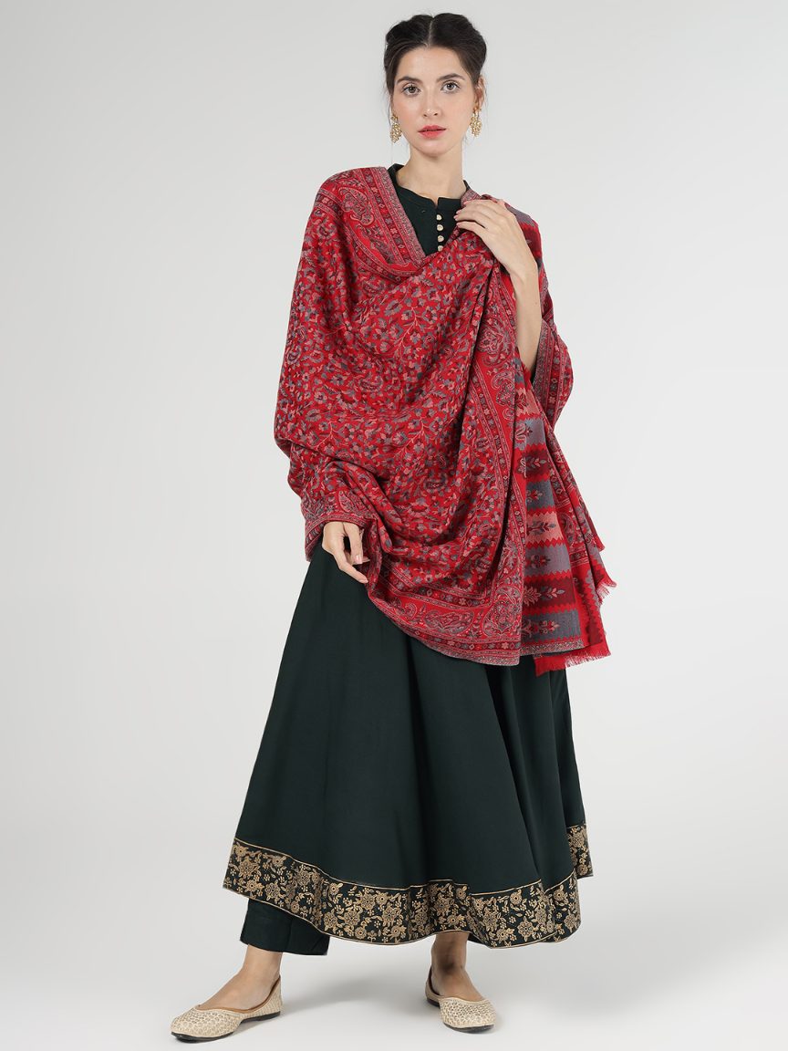 Faux Pashmina Traditional Paisley Jamawar Shawl – Crimson Elegance