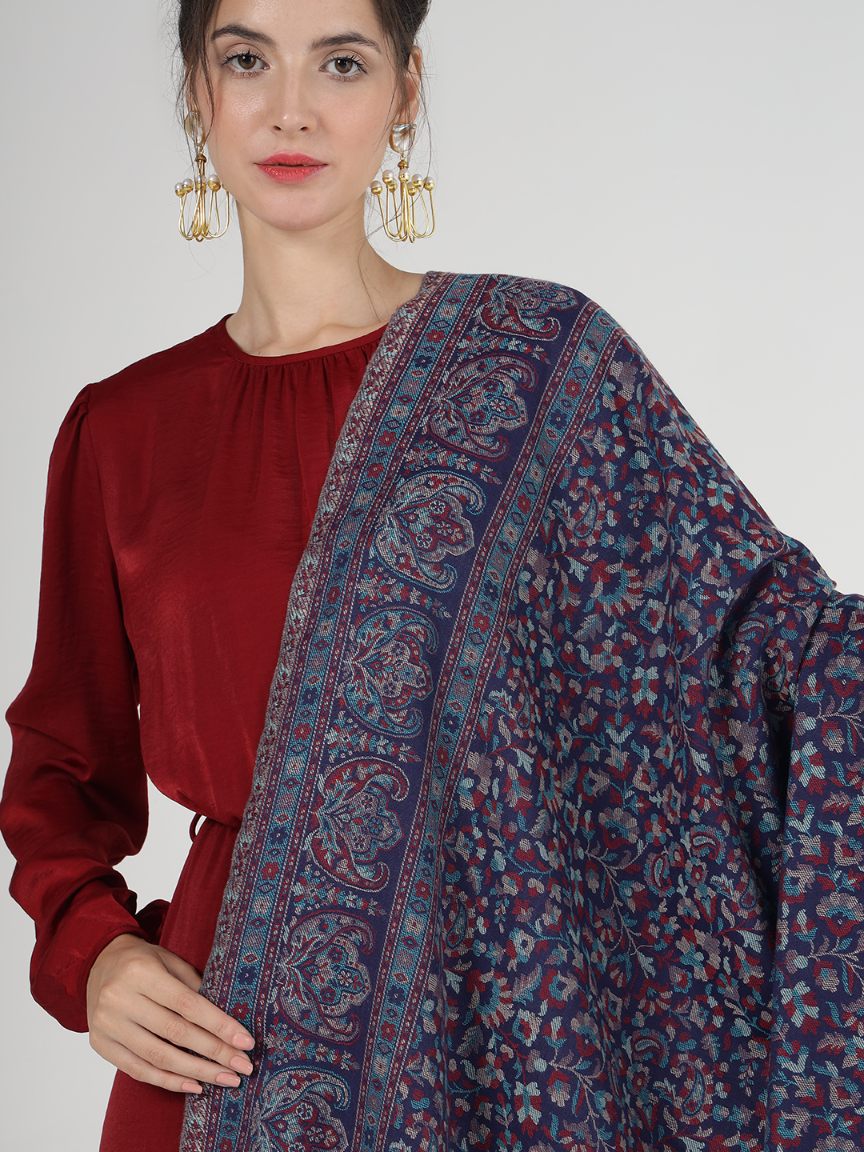 This exquisite stole is made from a premium blend of wool that ensures both comfort and style. The stole showcases the remarkable Kani craftsmanship, which traces its origin to Kashmir. The intricate black and blue undertones, combined with multicolored floral-paisley embroidery, can elevate any outfit.